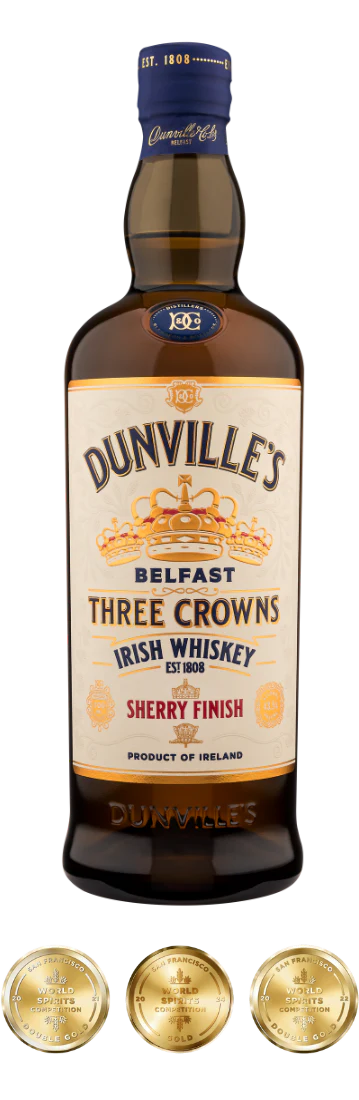Dunville’s Three Crowns Irish Whiskey is a premium vintage blend of superior aged whiskeys finished in three of the finest sherry casks. Double Gold at the San Francisco Spirits Awards in 2023.